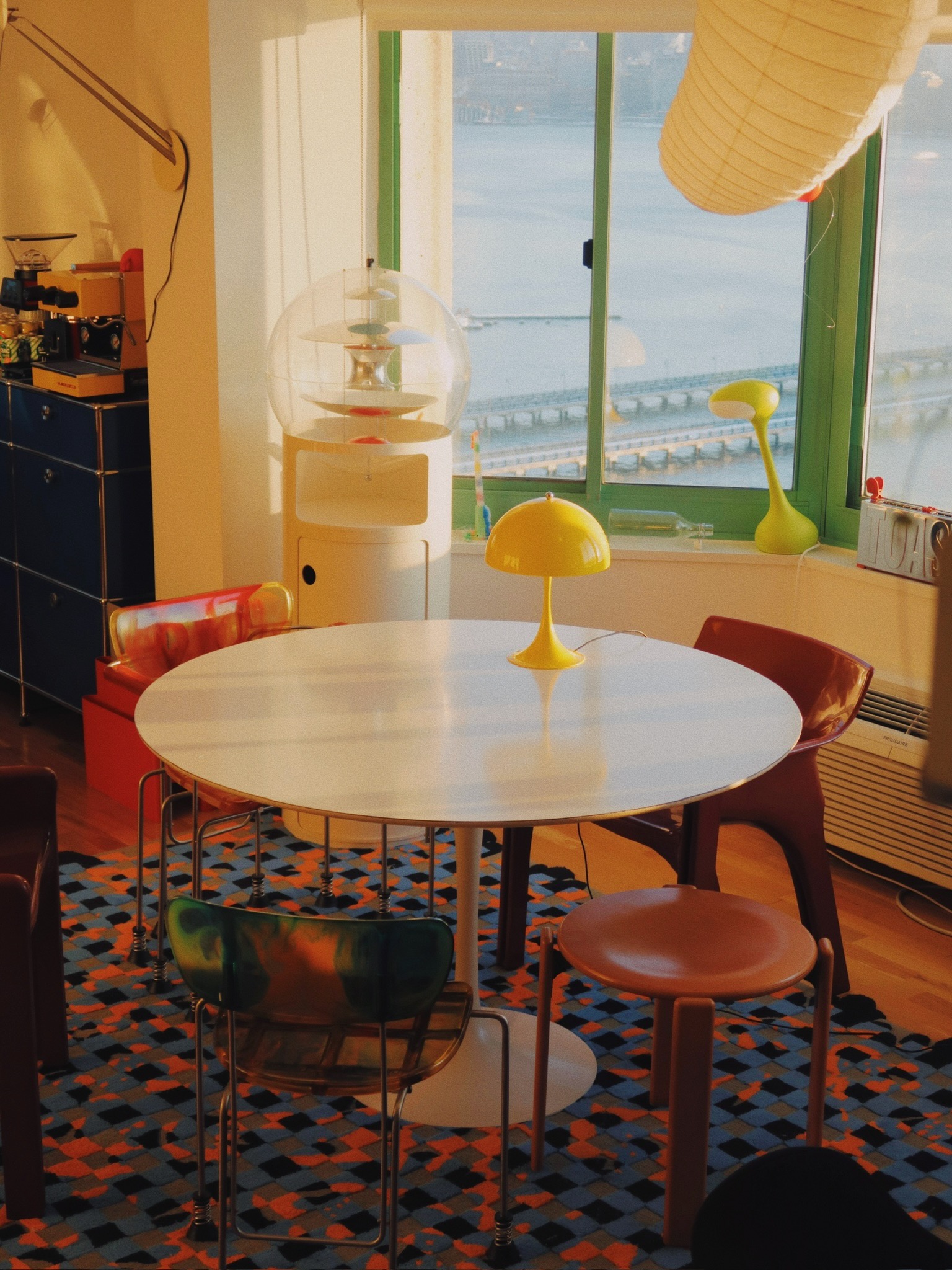 Turning back to his home, Shawn says that the questions people ask when they first come over are, “‘How many chairs do you have?’ and ‘How much do you spend on electricity?’” – the latter one prompted by some 50 lamps he has around the living room. If in his professional life Shawn is more singularly focused on contemporary design by emerging talent, at home his sensibility would be better compared to that of a curator of an archival design museum (a role, which, at the rate he’s going, surely isn’t far off). Lighting in the space spans lamps by Joe Colombo, Louis Poulsen, Karim Rashid and Emilio Fabio Simion, all of which are overseen by Shawn’s favourite piece, the ‘YaYaHo’ lighting system by Ingo Maurer, suspended from the ceiling. “I got it vintage, but it was missing a specific transformer. When I contacted the company, they quoted me $1,200 for it. One Christmas Day, on the train home, I randomly searched for it on eBay and one had been posted five hours before for $150. It’s the luckiest I’ve ever got,” he says.