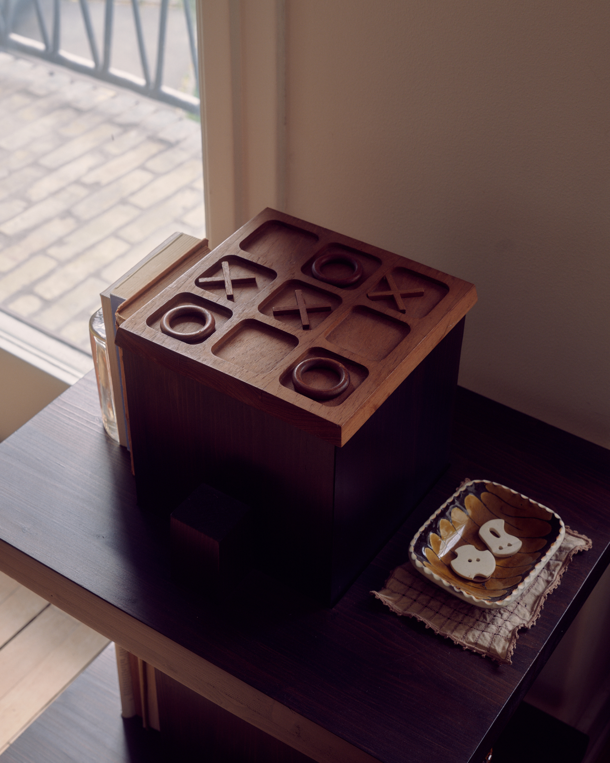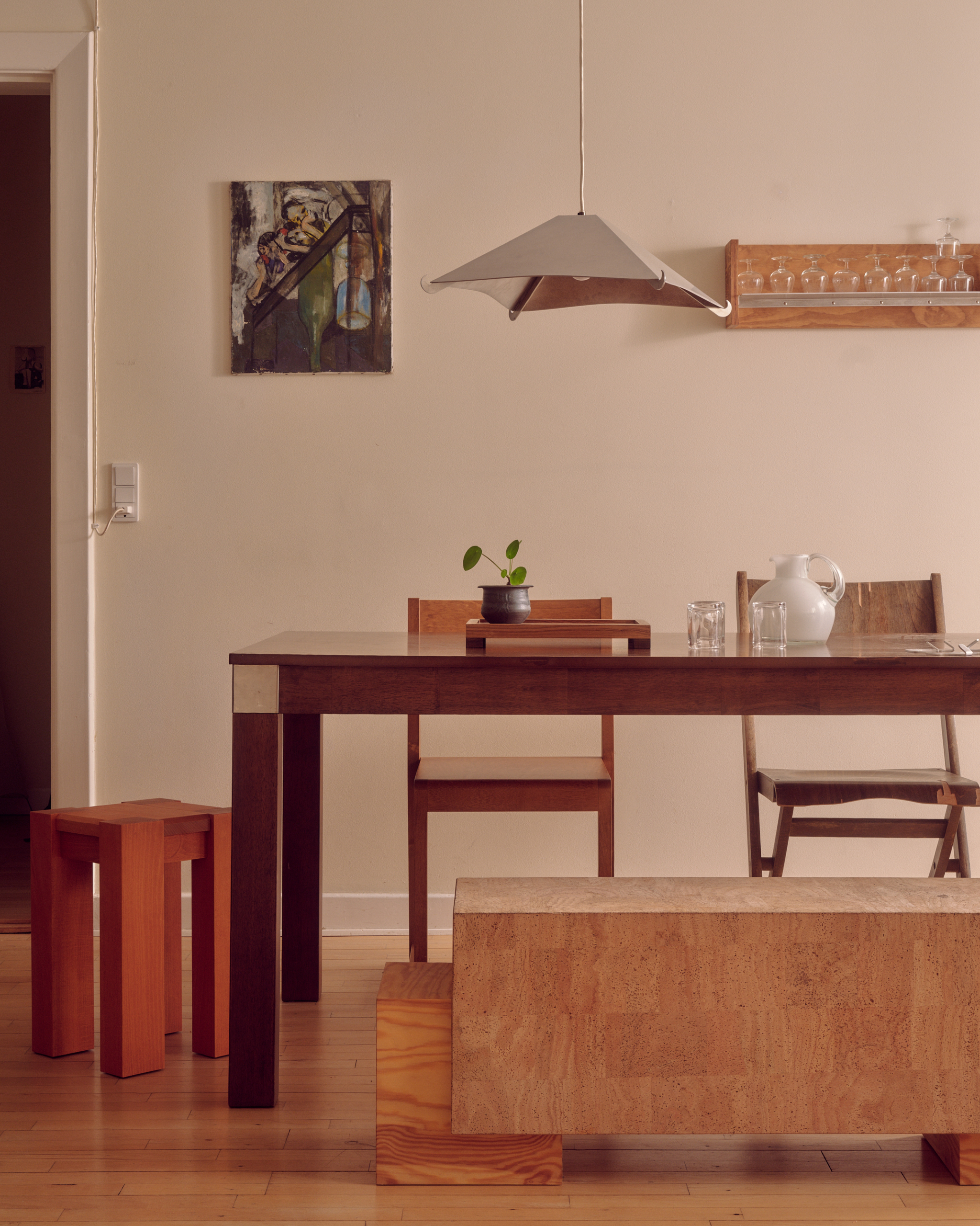 Martina shares the flat with her partner, and though her co-founder, Lewis Graham, lives in London, the home is a kind of second base for Apohli, the studio they run together. Their work – furniture, lighting, small objects – often begins from a place of necessity or memory: the table they couldn’t find, the lamp they wish existed, the shelf reminiscent of one from their childhood. The apartment, naturally, is full of these pieces: the prototype sofa Martina built herself when she couldn’t find one she liked; a coffee table engraved with branching patterns inspired by beetle-eaten bark; a magazine rack based on one her mother always had. Other objects are found or gifted, made by friends or unearthed on Facebook Marketplace. Like the practice itself, the space is intuitive, textured, and layered – a patchwork of making, sharing, and revising.