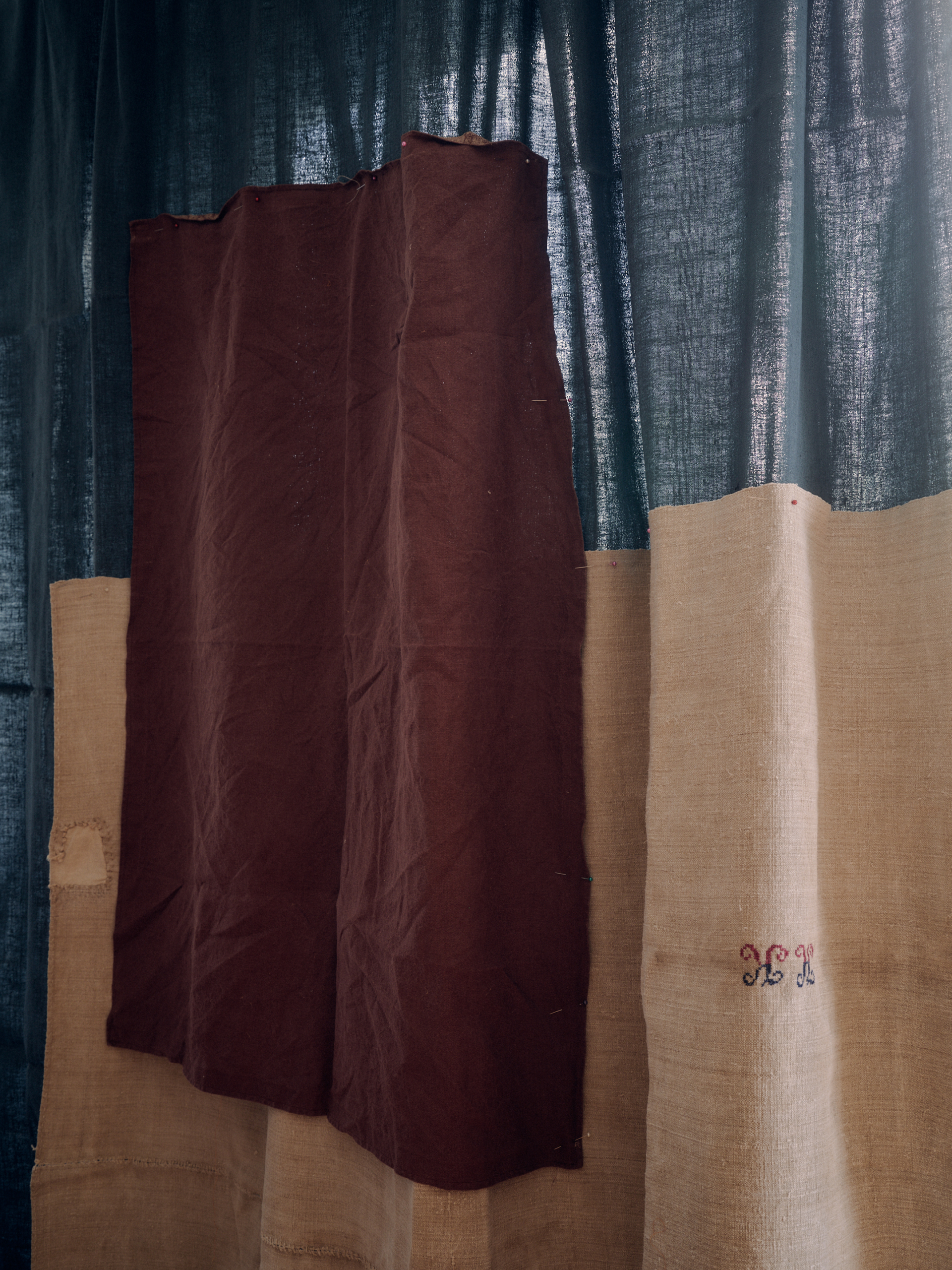 Isabel: I get most of my linen from a wonderful dealer who goes to Hungary and finds these incredible old sheets. They’re so lovely to work with because the textures are beautiful, they’ve got these hand-sewn seams in all the wrong places, but that makes them really interesting. I also use our old family sheets, even baby cot sheets. There’s something about starting with scraps that feels natural to me – I think that comes from my time at The Cass, where I used to scavenge from piles of offcuts. I’ve always worked quite intuitively, more like “George’s Marvellous Medicine” than following a strict plan.