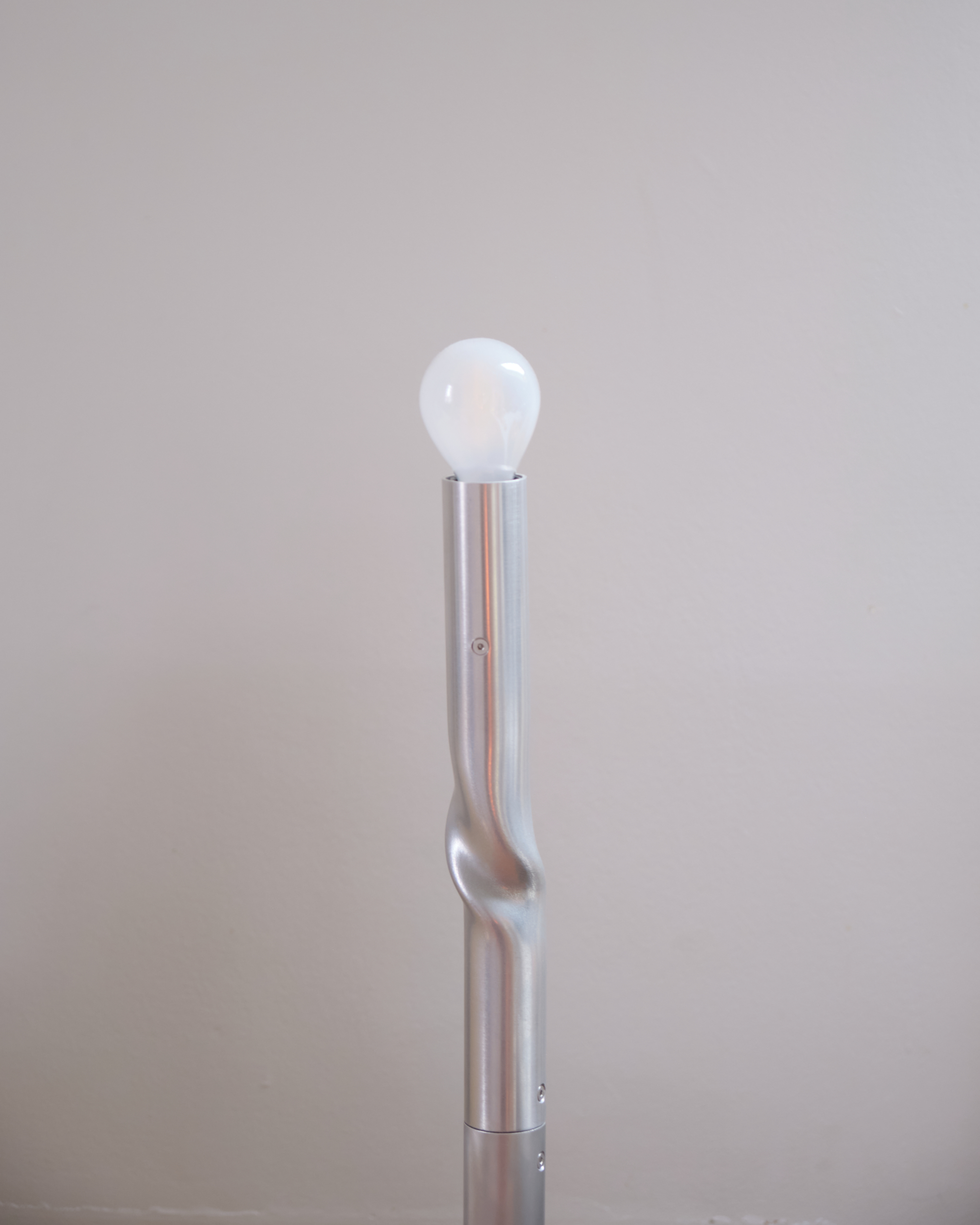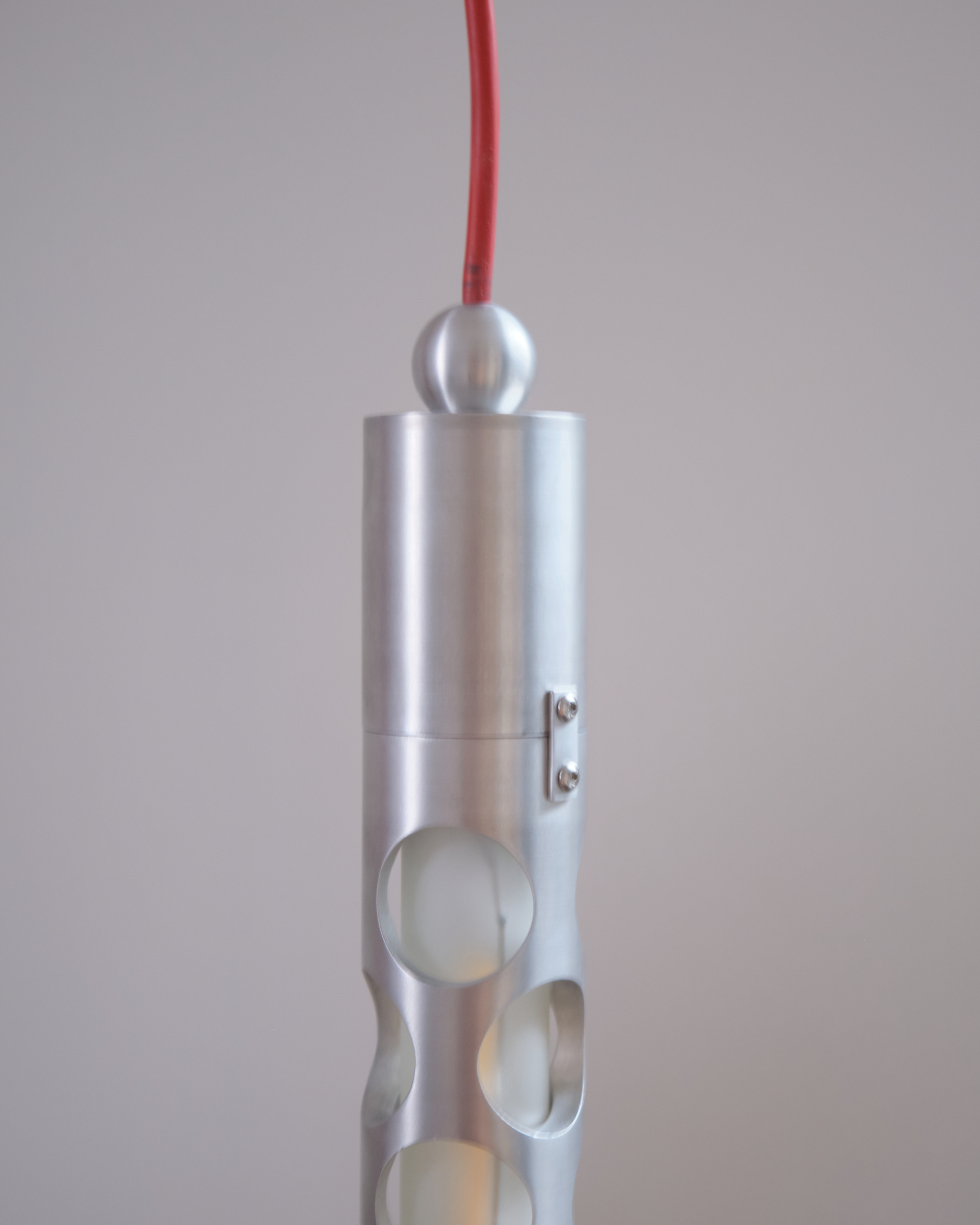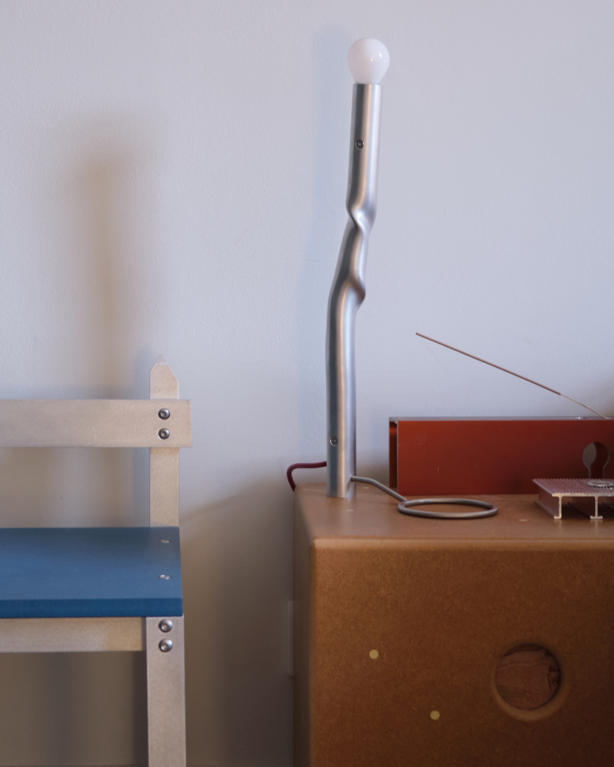 The off-cut from that tube became the pendant lamp. It was covered in holes from cutting the washers, and every time someone came by the studio they’d tell me it had to be a lamp. So I put a long bulb through it. It’s really nice that something born out of one piece continues in another. It’s not quite cannibalising, but something adjacent; it just keeps existing down the line.