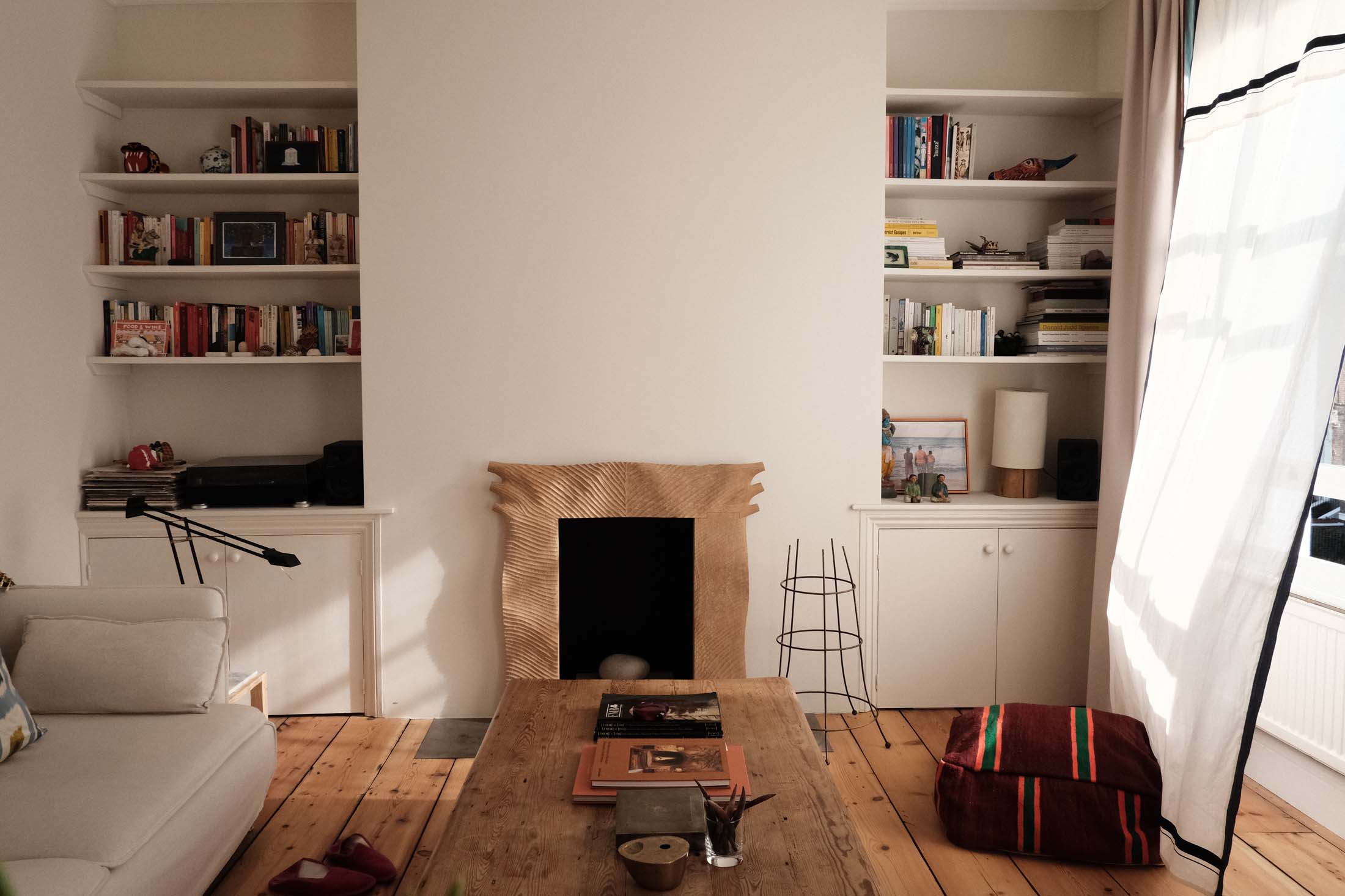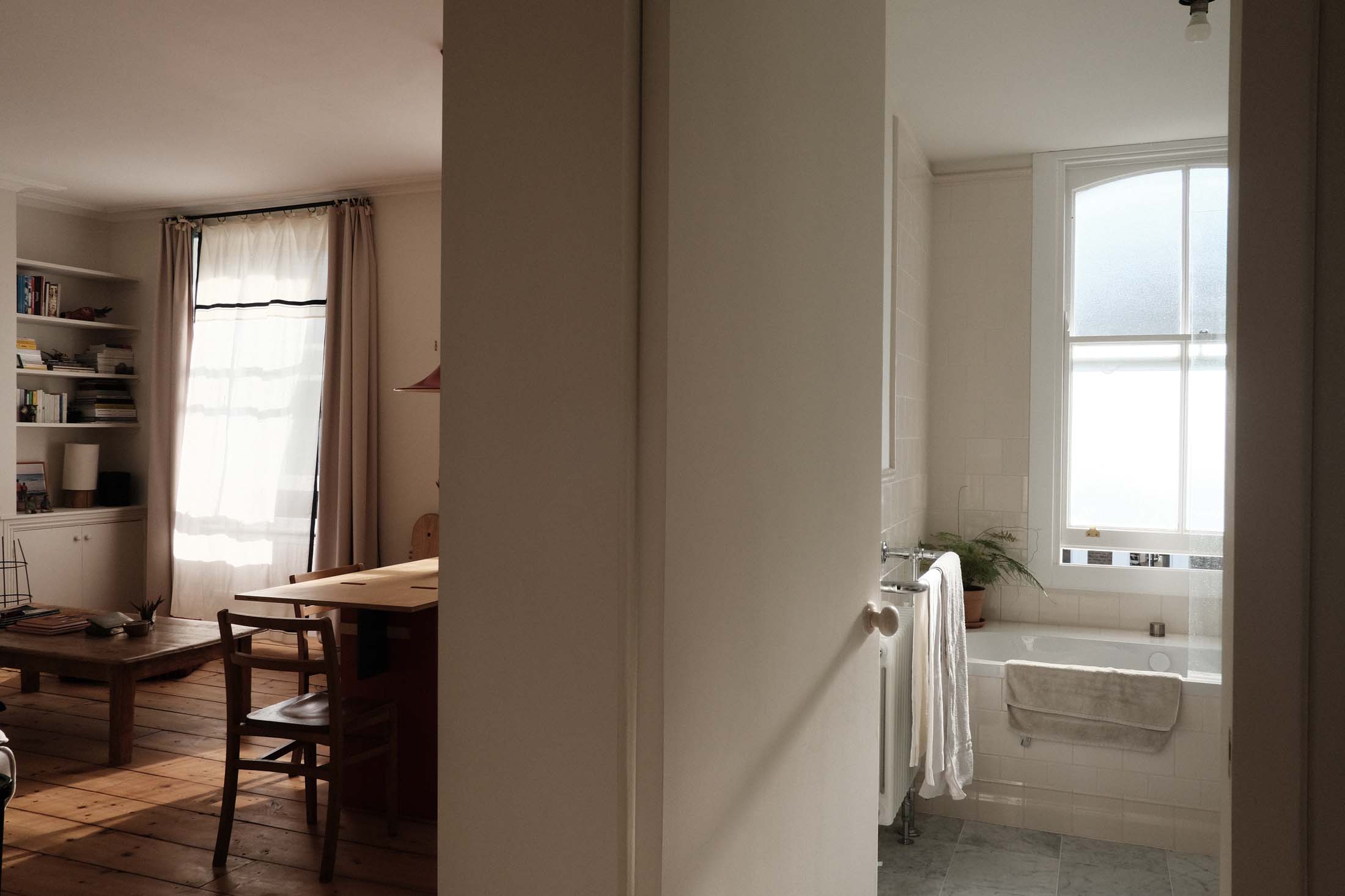 The one-bedroom flat in a Victorian townhouse in De Beauvoir, north London, has been home to Margherita and her husband, Oliviero Muzi Falconi, for one year now. “It took three months to do the works,” explains Margherita, who recently set up her own practice, Zompa Studio, after working for the likes of William Smalley and David Chipperfield. Although she wanted to keep things “quite minimal,” there was work to do to peel back the layers of less successful renovations. “There was carpet all over, lino in the kitchen, a heavy cast iron fireplace and an awkward utility cupboard that took up some of the living room,” she explains. “We wanted to bring everything back to its bones.”