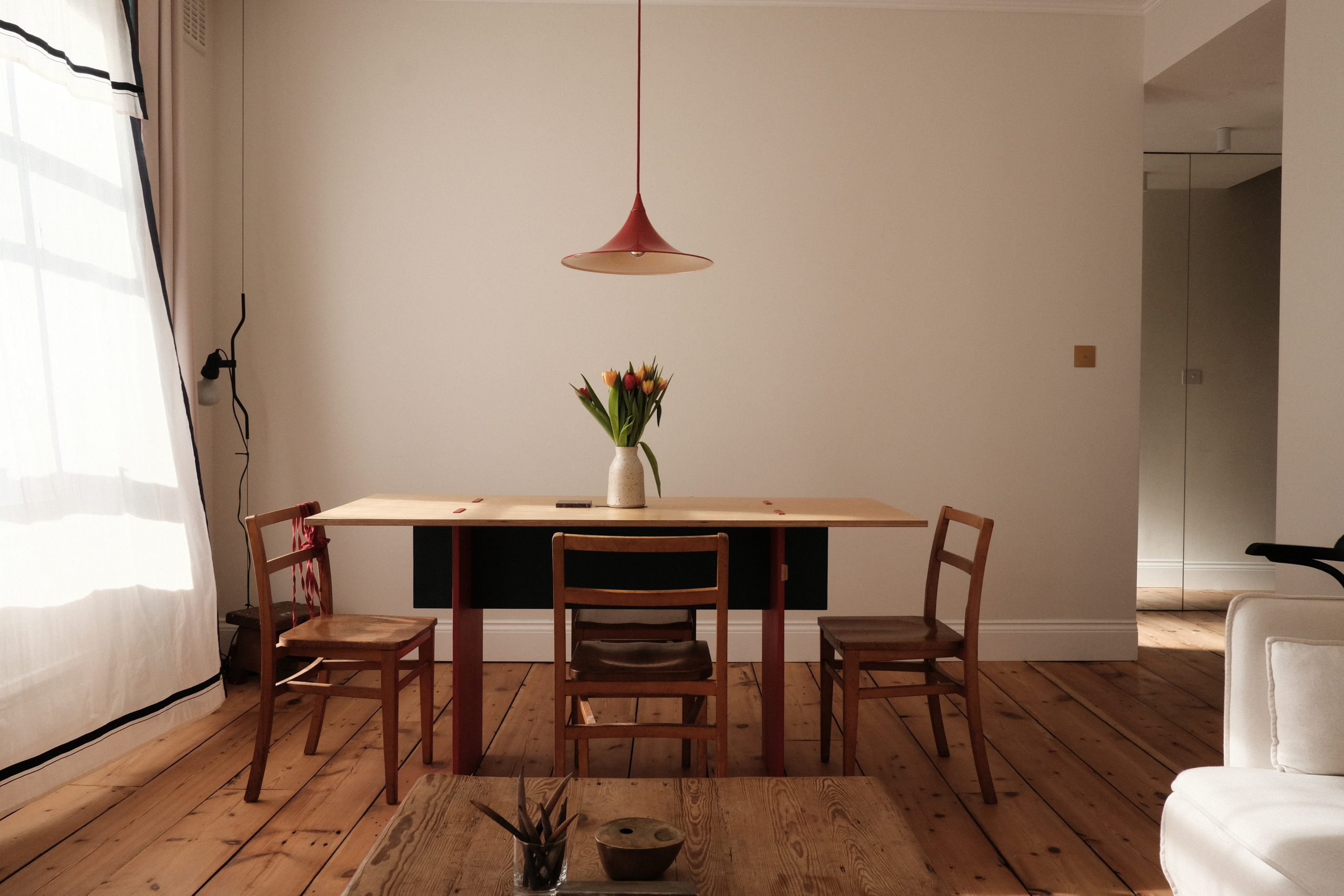 As it turns out, the dining table that Filippo made for Margherita and Olviero’s last place, with its structural elements stained red and blue, perfectly matches the curtains Margherita had made from some saris she found in India. “It was completely by chance,” she says, explaining that the colours on the fabric are subtle, something she likes. Other textiles, like a white linen sheet found in Rome, now draped over the sofa, are more muted still, allowing more concentrated moments of colour to pop: a volcanic red Semi pendant lamp over the dining table and a carpeted floor cushion picked up in the Atlas mountains, which is “part of a wider collection of found objects that have caught my eye over the years, each from a different place and moment in time,” she explains.