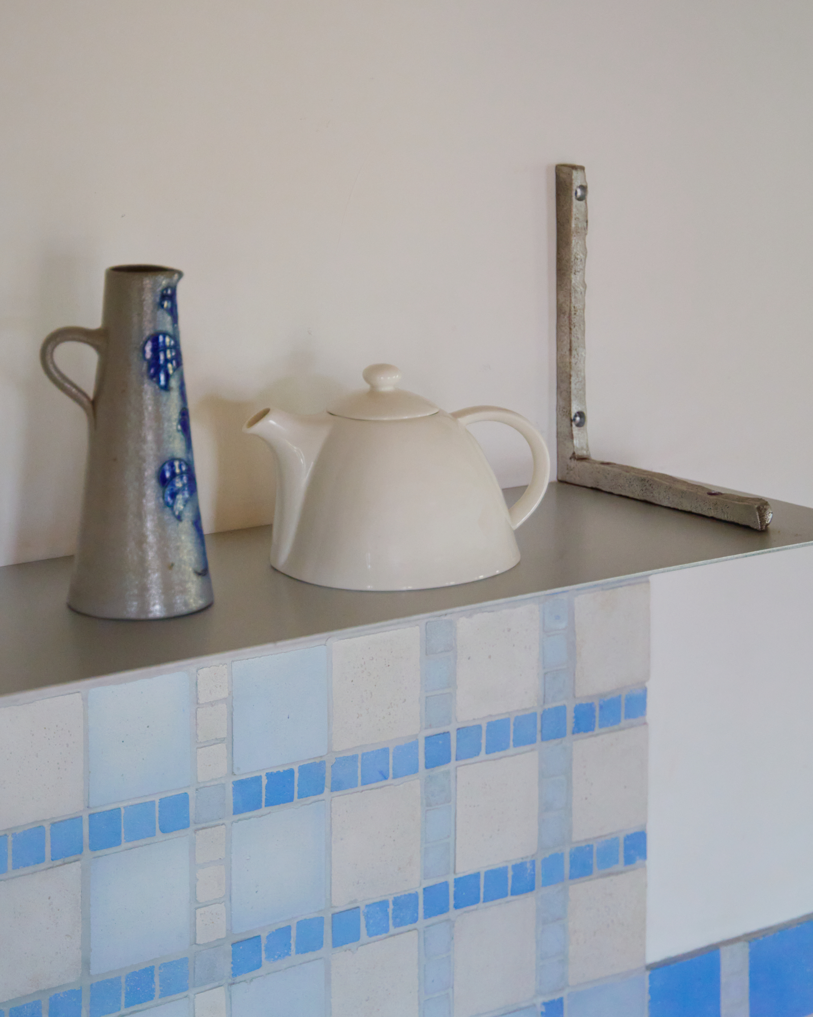 Throughout, there was a desire to stay connected to the region. Alsace has a distinct visual identity defined by timber framed buildings, traditional folk costumes and its emblem, the migratory white stork that spends its summer in the region. While Madeleine and Lewis didn’t want to recreate this literally, they allowed Alsatian influences to permeate in subtle ways. The tiles behind the kitchen are of a traditional kelsch pattern; the wide bench in the dining area, made from reclaimed pine, feels like it could have been there for decades – only the sharp, triangular cuts across its form reveal a more contemporary hand. “It was about keeping some of the feeling,” says Lewis. “But making it ours.”